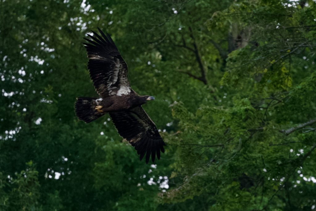 The eaglet called out repeatedly and as time went on – and the light dimmed – his/her calls became more desperate. Then it was clear something had caught the eaglet’s attention and it took off flying a circle above me.
