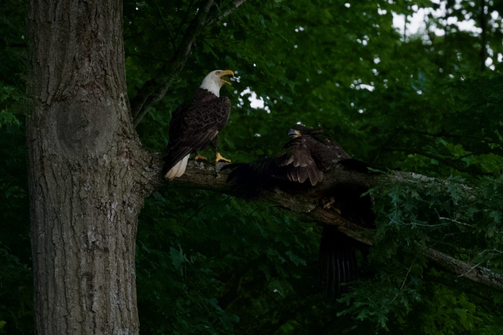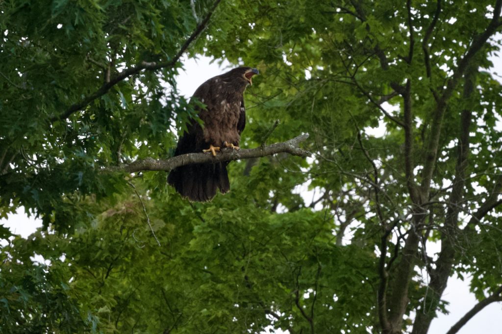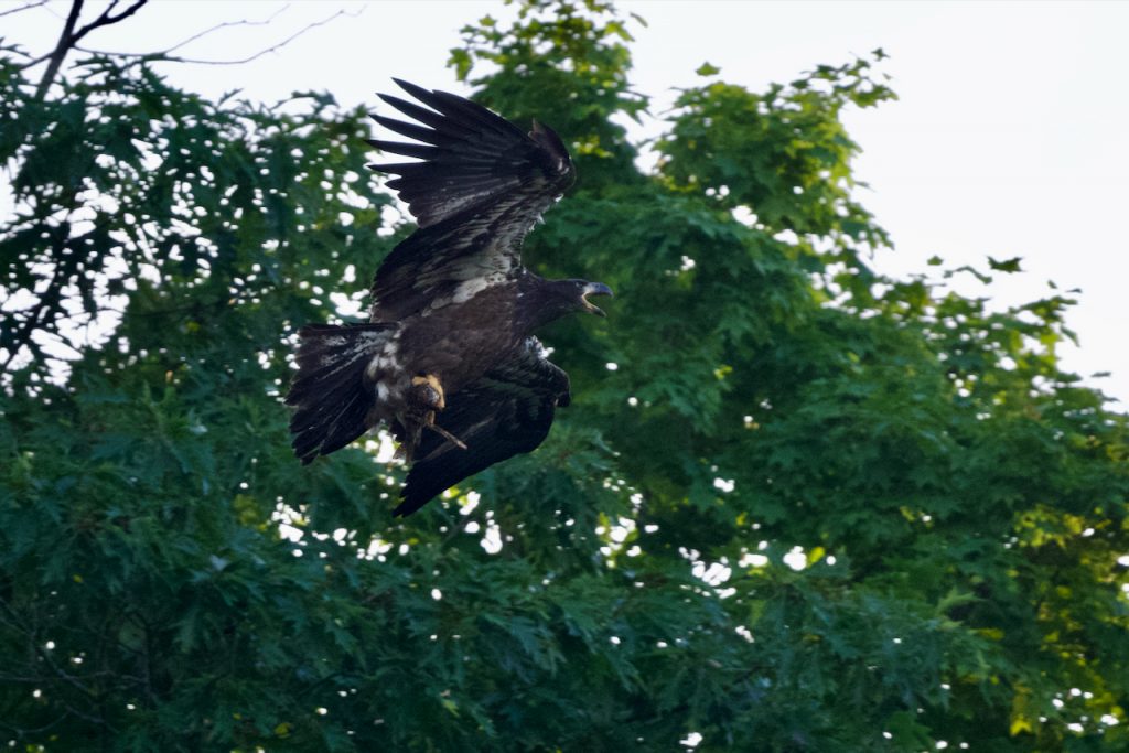 The two eaglets are mastering the art of flying. They seem quite comfortable getting from point A to point B and, on several occasions, have flown near me landing on bare trees. Then they will call out for food.