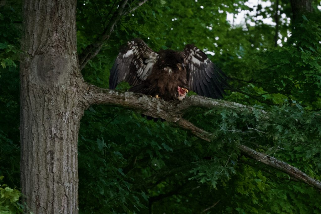 For a while I wasn’t sure if the eaglet had injured itself as one wing was now draped over the branch. The screams continued while the adult remained there for a minute or two. Then I could see, through my camera lens, there was some prey in the eaglet’s talons. When the eaglet shielded the prey by stretching out its wings the adult took off.