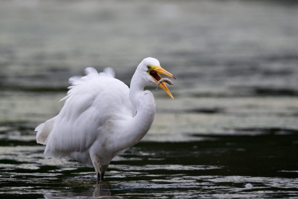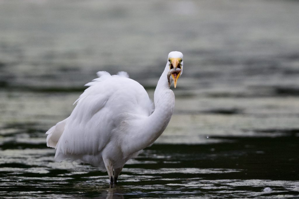 Quite by chance, while looking for possible locations where they might be fishing, I spotted a solitary great egret on a pond a few kilometres away. Members of the heron family they are a little smaller than blue herons and are often seen in close proximity to their cousins.