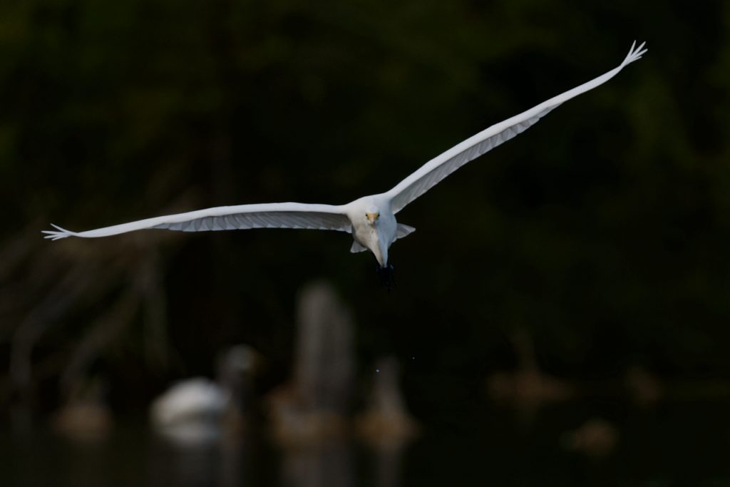 And they did – one at a time – which afforded lots of opportunities for head-on flight shots. Unfortunately, it was hard to keep track of which great egret was which. Only when my favourite would venture into her usual places near my vantage point could I identify her.