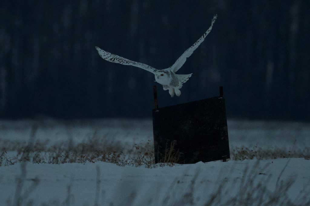 I trudged through deep snow and chose a vantage point that gave me a contrasting background where I settled down in the snow. Since it was getting near twilight I could see her looking around in different directions. ‘Fly this way’, I whispered. Although the light was poor I was pleased when she did fly past me and landed on a nearby grain silo.